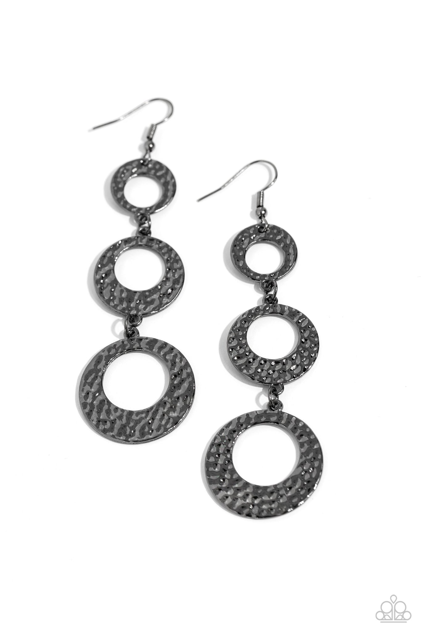 Gradually increasing in size, a stunning trio of hammered gunmetal hoops link into an oversized lure for a classic metallic look. Earring attaches to a standard fishhook fitting.