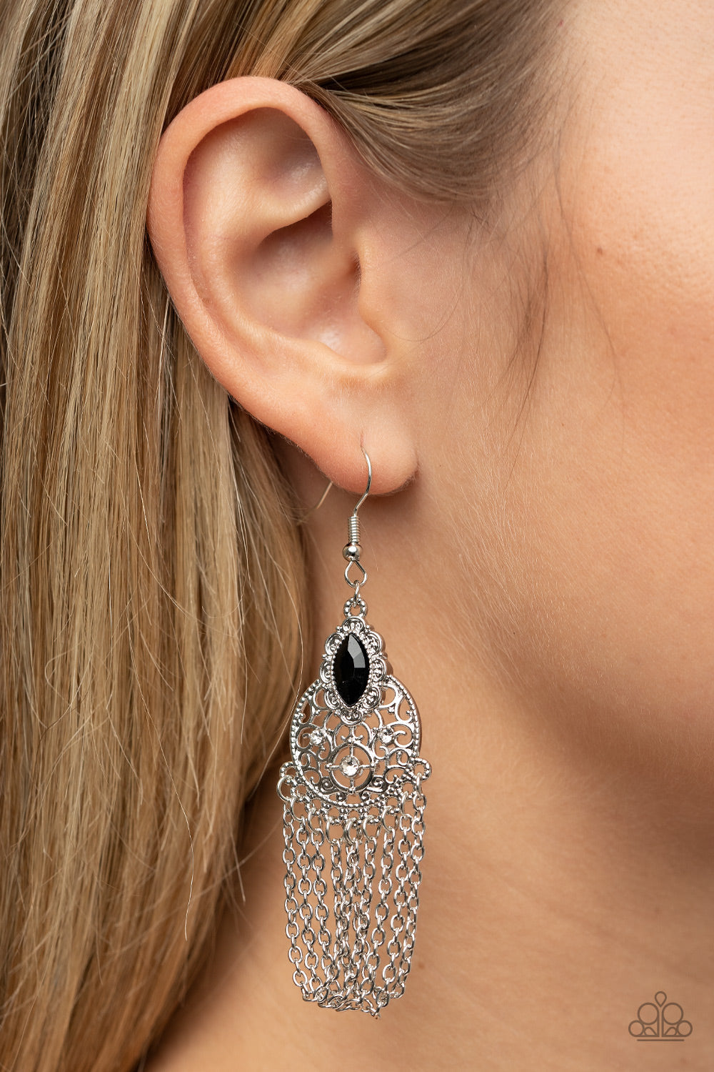 A marquise cut black rhinestone is pressed into a scalloped silver frame atop a circular silver frame abloom with vine-like filigree. Dotted in dainty white rhinestones, the decorative frame gives way to a fringe of silver chains for a whimsical finish. Earring attaches to a standard fishhook fitting.