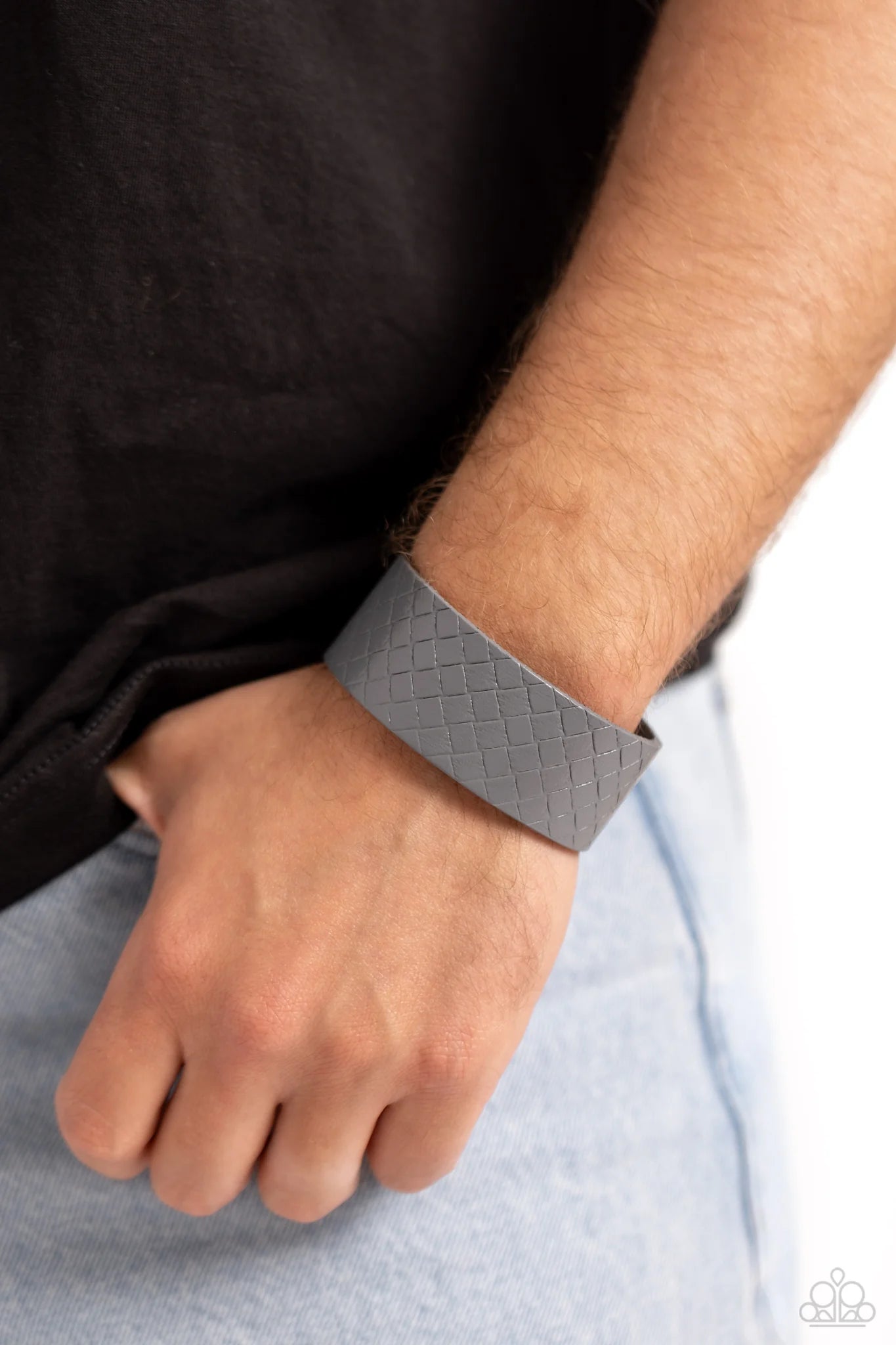 Stamped in a tactile diamond pattern, a shiny piece of Ultimate Gray leather wraps around the wrist for a rustic flair. Features an adjustable snap closure.