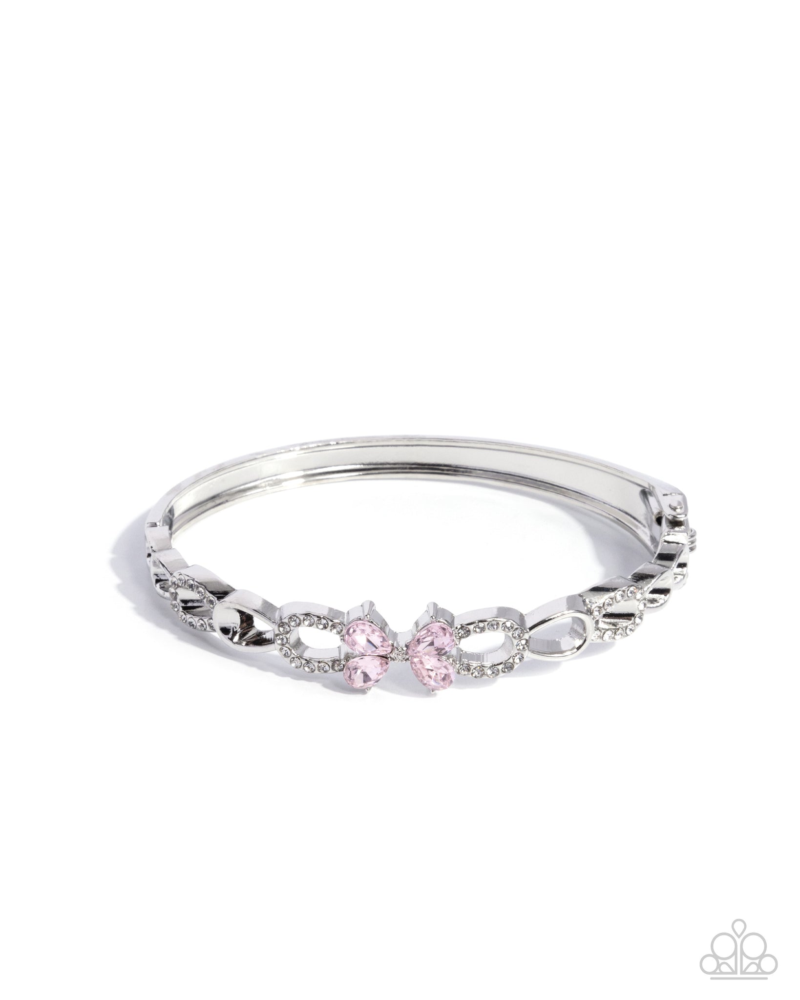 Dusted in white rhinestones, interconnected silver hoops coalesce across the front of the wrist, alternating with sleek silver hoops for a refined display. A faceted pink teardrop-winged butterfly flutters atop the center for a whimsical finish. Features a hinged closure.