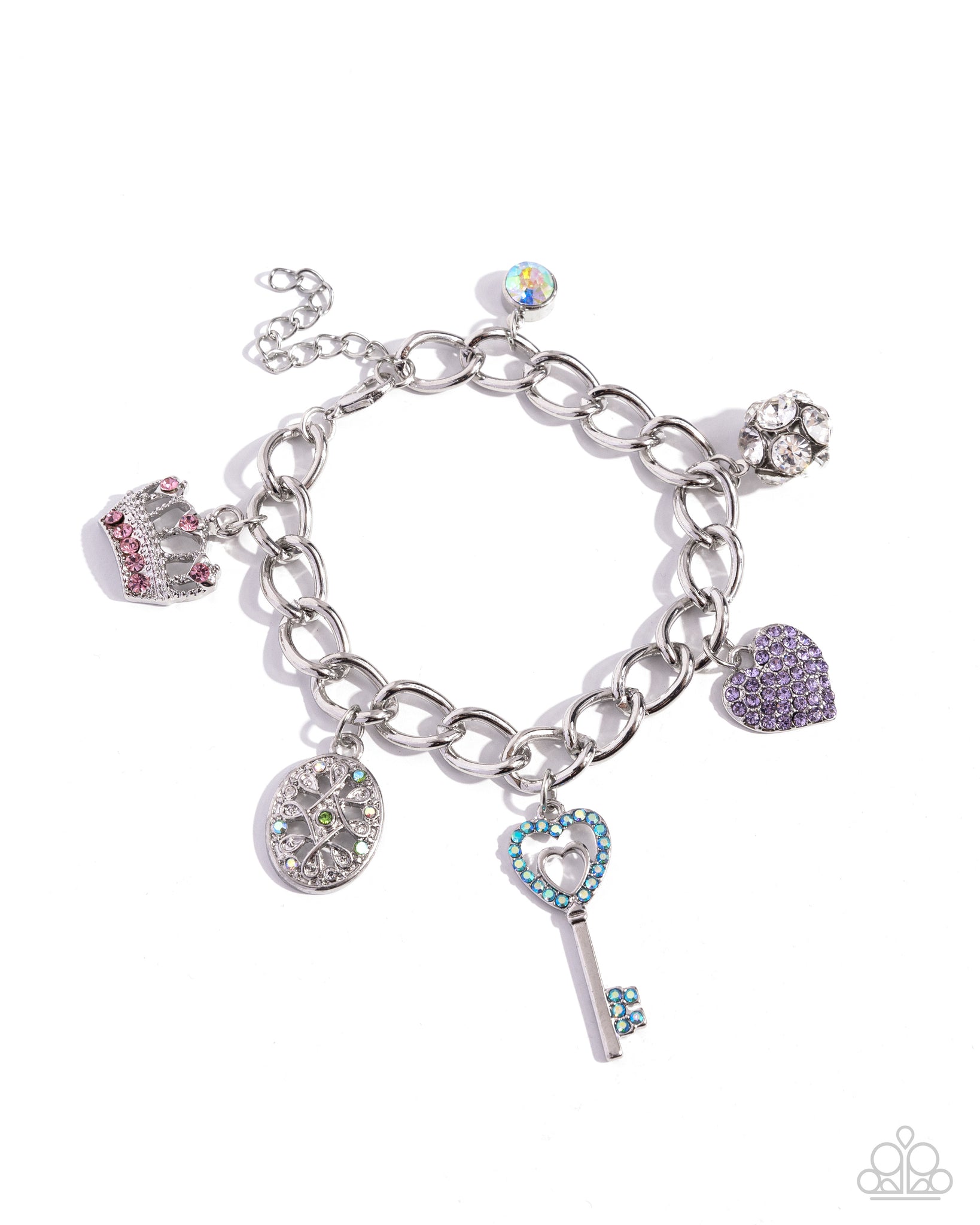 Swinging along a silver curb chain, a collection of regal silver charms including a pink rhinestone-encrusted crown, a solitaire iridescent rhinestone, a heart key encrusted in aquamarine iridescent rhinestones, a white gem-encrusted ornament, a violet rhinestone-encrusted heart charm, and a swirly filigree pendant dotted with green and blue iridescent rhinestones coalesces around the wrist. Features an adjustable clasp closure. Due to its prismatic palette, color may vary.