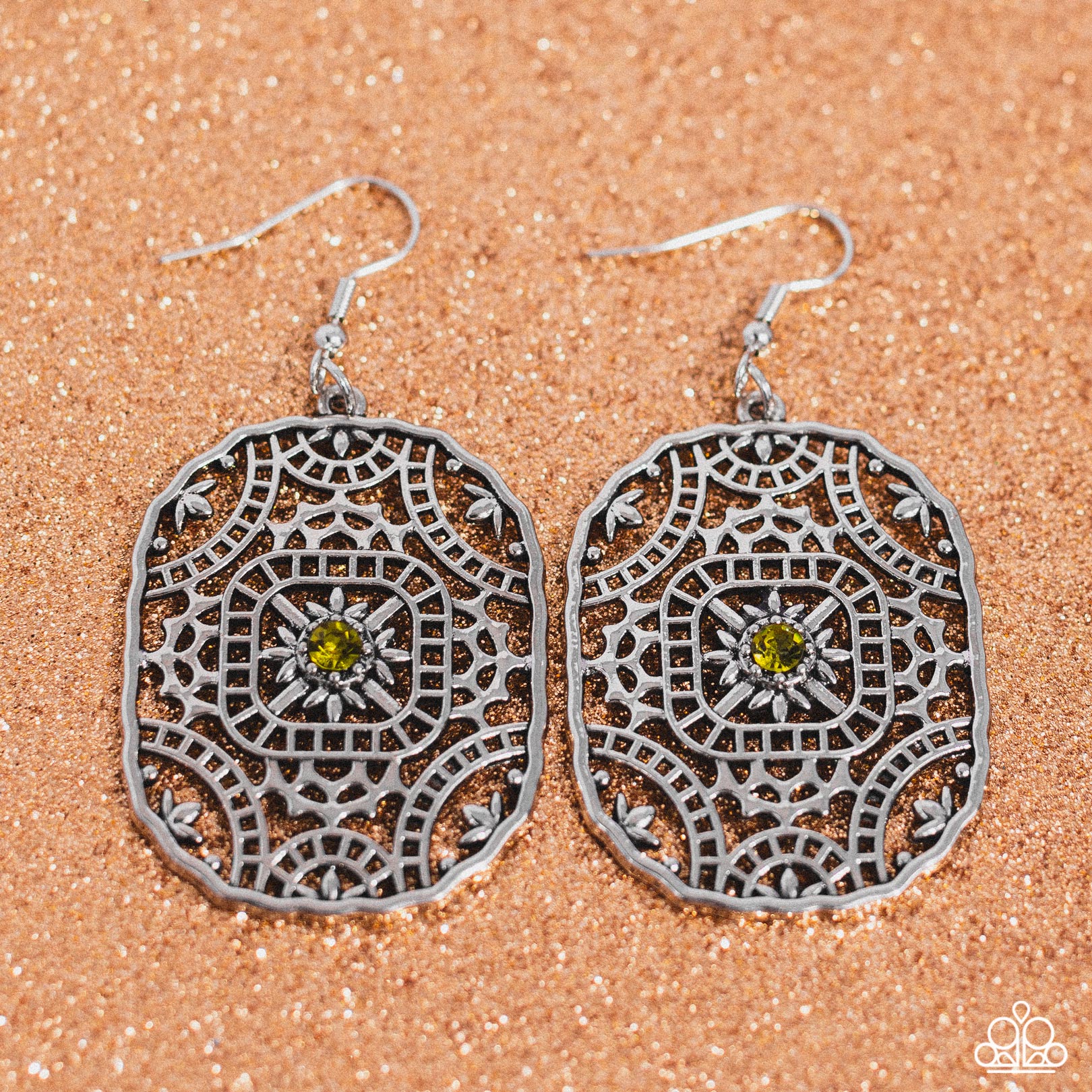 Dotted with a glittery green rhinestone center, a floral filigree textile motif blooms inside a daintily scalloped silver frame for a seasonal pop of color. Earring attaches to a standard fishhook fitting.