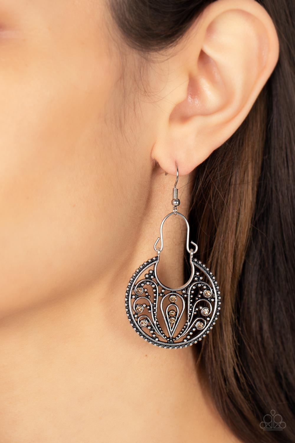 Dotted with golden topaz rhinestones, a studded crescent shaped frame is filled with vine-like filigree as it swings from a dainty silver wire fitting for a whimsical flair. Earring attaches to a standard fishhook fitting.