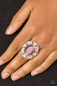 Shimmery floral-like filigree swirls around a glowing purple moonstone center, creating a whimsical centerpiece atop the finger. Features a stretchy band for a flexible fit.