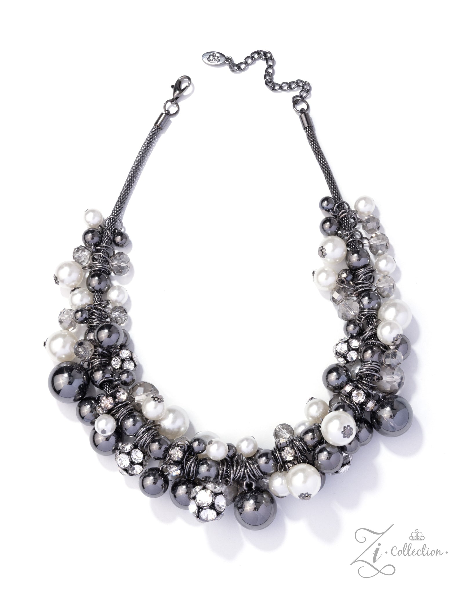 An attention-commanding collection of glossy gunmetal spheres, faceted smoky beads, glistening white pearls, sleek gunmetal rings, and rhinestone-encrusted gunmetal accents in varying sizes collide in a fierce explosion of texture and shine. Cascading below the collar along a bold gunmetal mesh chain, the dramatic clusters swing with an air of sophistication, while the multi-dimensional palette of shimmer and polish evokes a powerfully poised presence. Features an adjustable clasp closure.