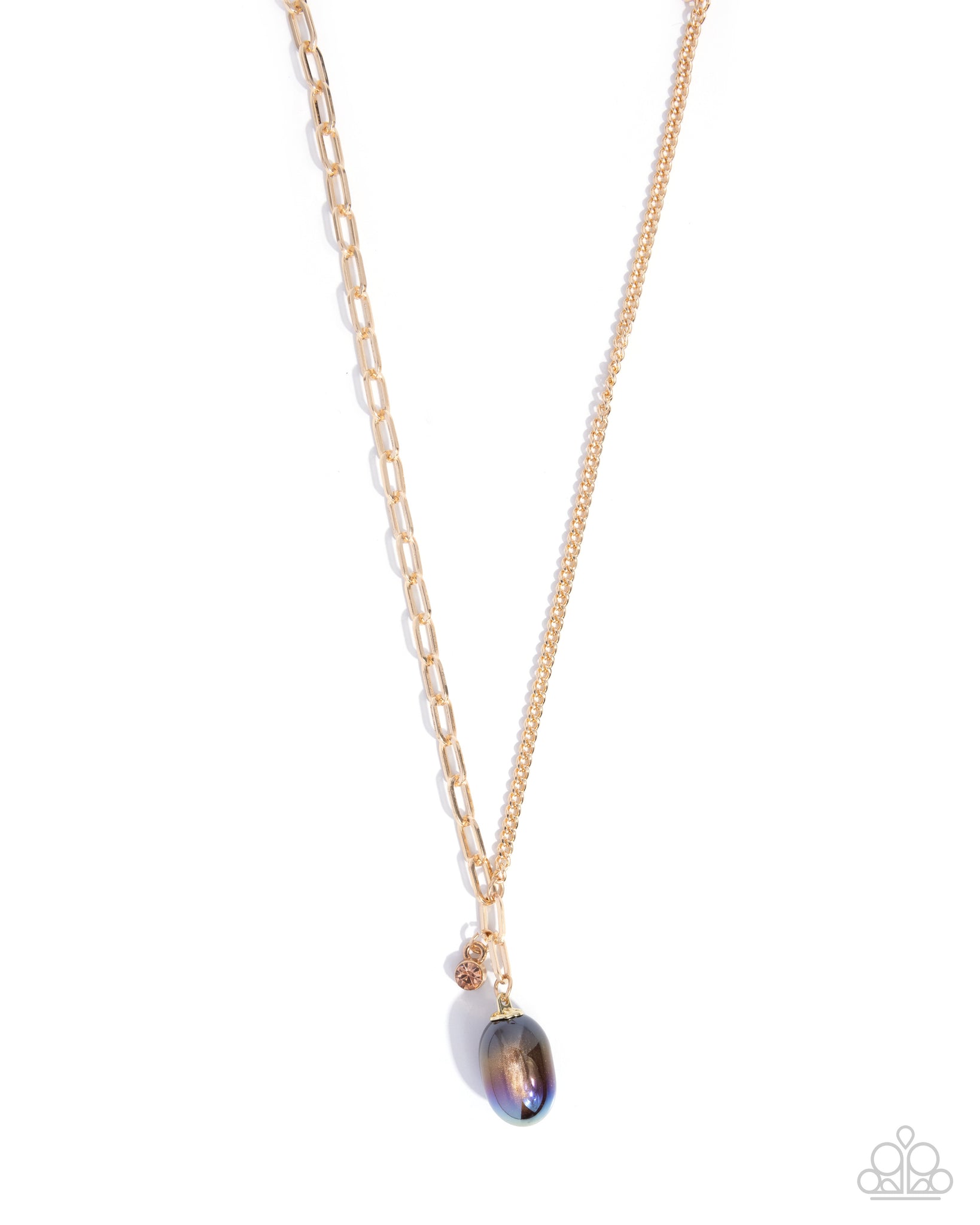Intersecting a gold paperclip chain, a classic gold chain completes the neckline-encircling display, giving way to a solitaire light peach rhinestone in a gold fitting and an ombré-splashed oval pendant that fades from brown to purple for an adorably abstract display. Features an adjustable clasp closure.