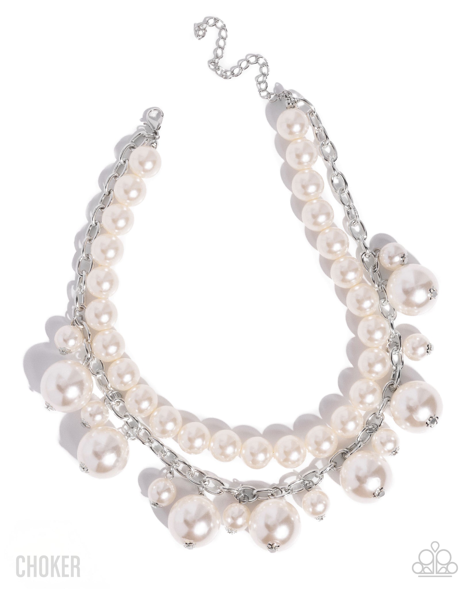 Featuring a high sheen, a polished collection of varying sizes of white pearls joins a paperclip chain row interspersed with additional white pearly ornaments alternating below the collar for over-the-top opulent layers. Features an adjustable clasp closure.