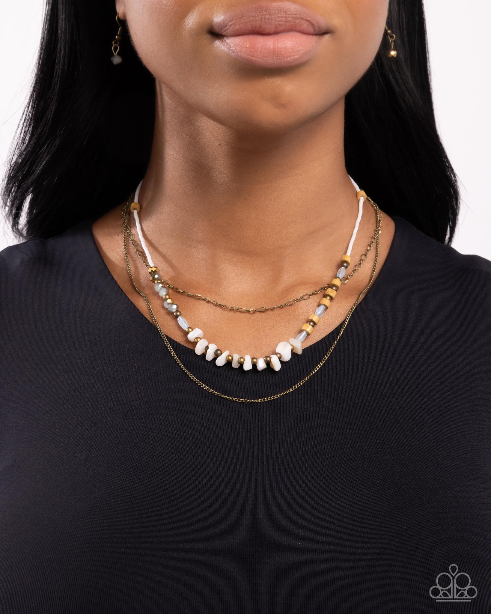 A mismatched trio of brass chains coalesce below the neckline. Infused along the middlemost chain, a collection of pearly white seed beads, wooden beads, brass studs, Winter Sky cylindrical beads, UV shimmery beads, and chiseled white stones bring in pops of color for a fanciful, textured display. Features an adjustable clasp closure. As the stone elements in this piece are natural, some color variation is normal.