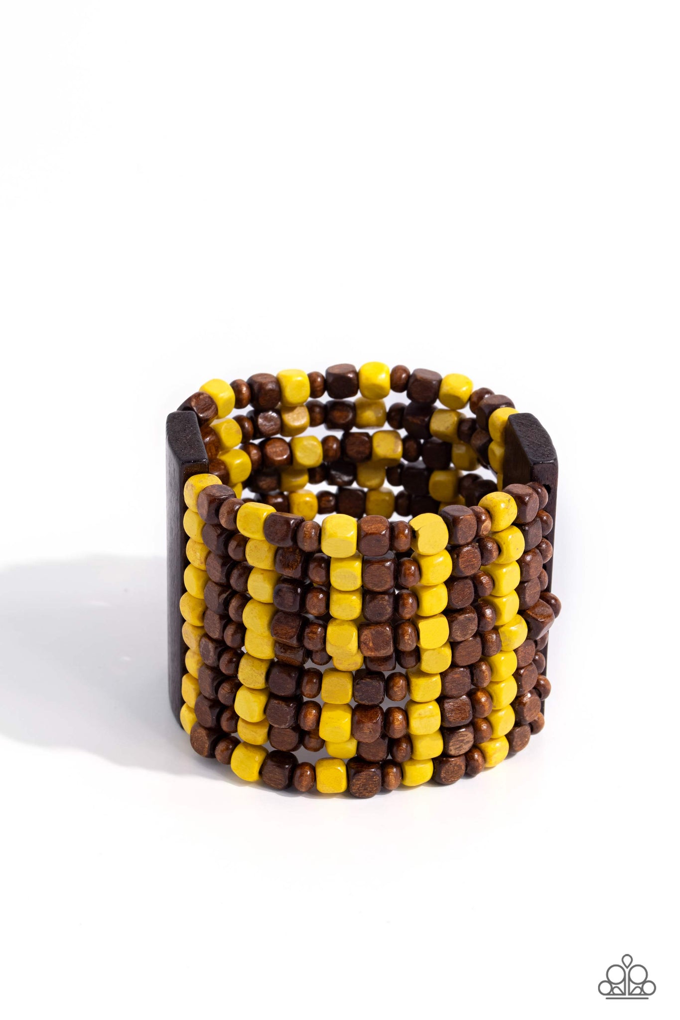 Held together with oversized rectangular wooden frames, a colorful assortment of brown and yellow cube beads are threaded along stretchy bands around the wrist, creating vivacious layers.