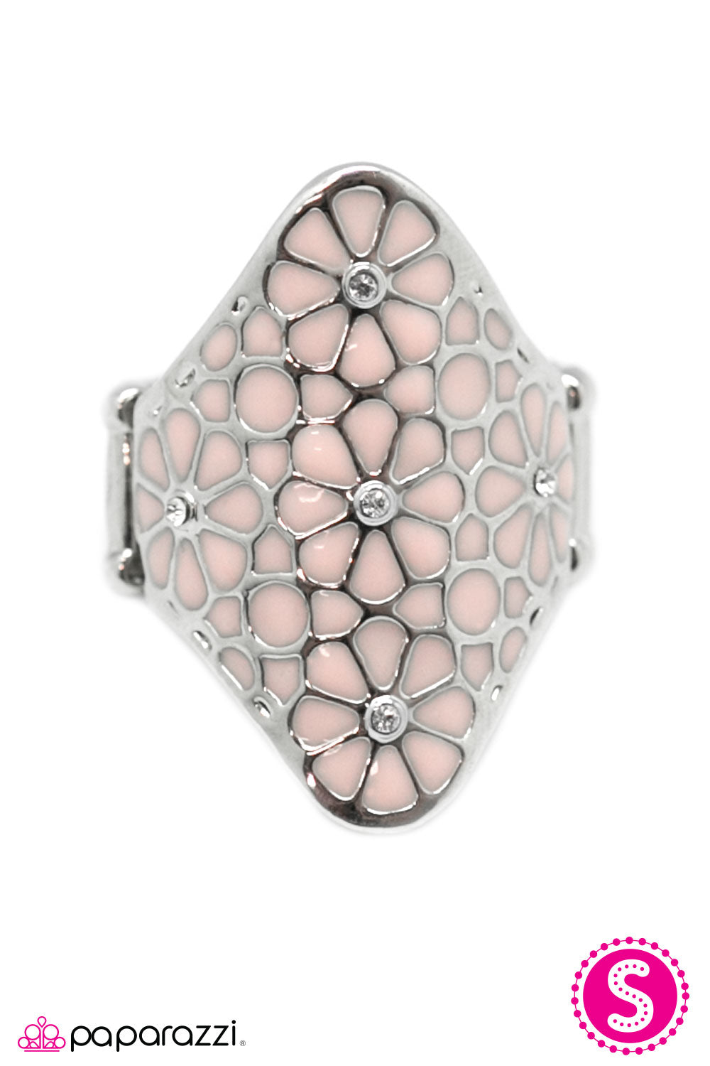 Countless pink petals overlap on an elongated silver plate to create an enchanting mosaic. Tiny white rhinestones dot the center of each pink flower, adding a touch of shimmer to the piece. Sold as one individual ring.