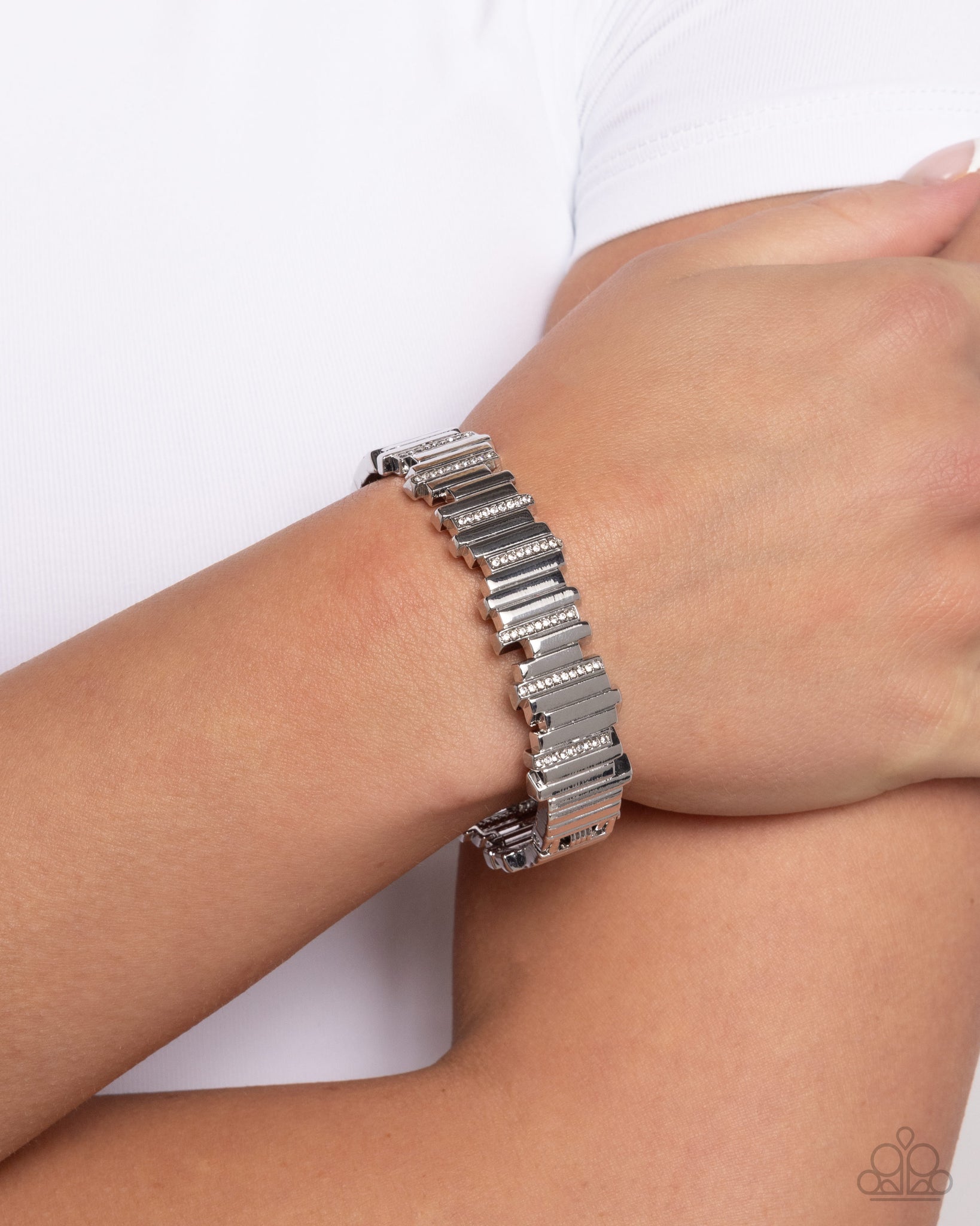 Flat silver bars in varying sizes are sporadically interrupted with white rhinestone-encrusted silver bars also in varying sizes that wrap around the wrist, creating an eye-catching look. Features a hinged closure.