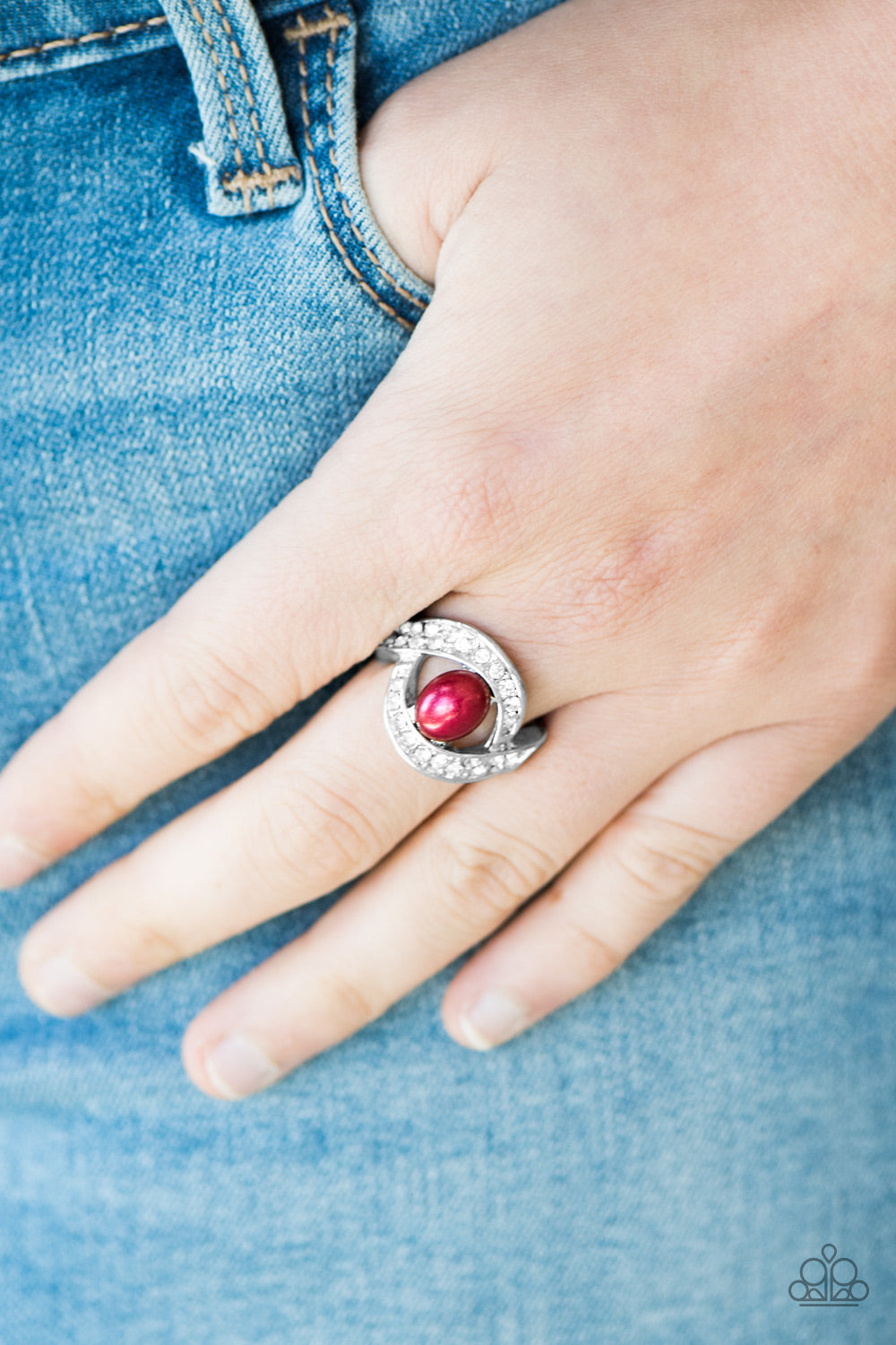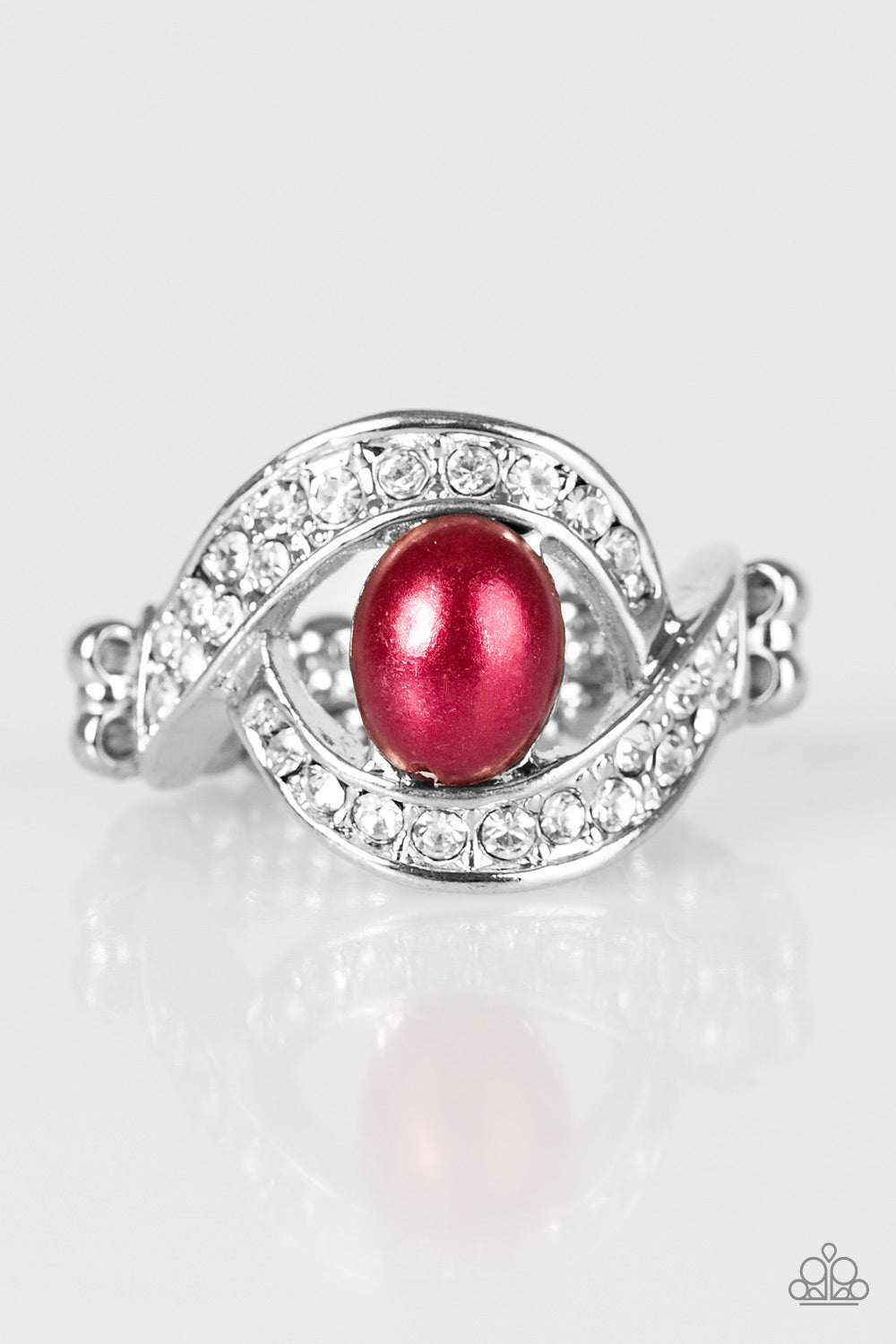 Encrusted in radiant white rhinestones, swooping silver bars swirl around a pearly red bead, creating a refined frame. Features a stretchy band for a flexible fit. Sold as one individual ring.