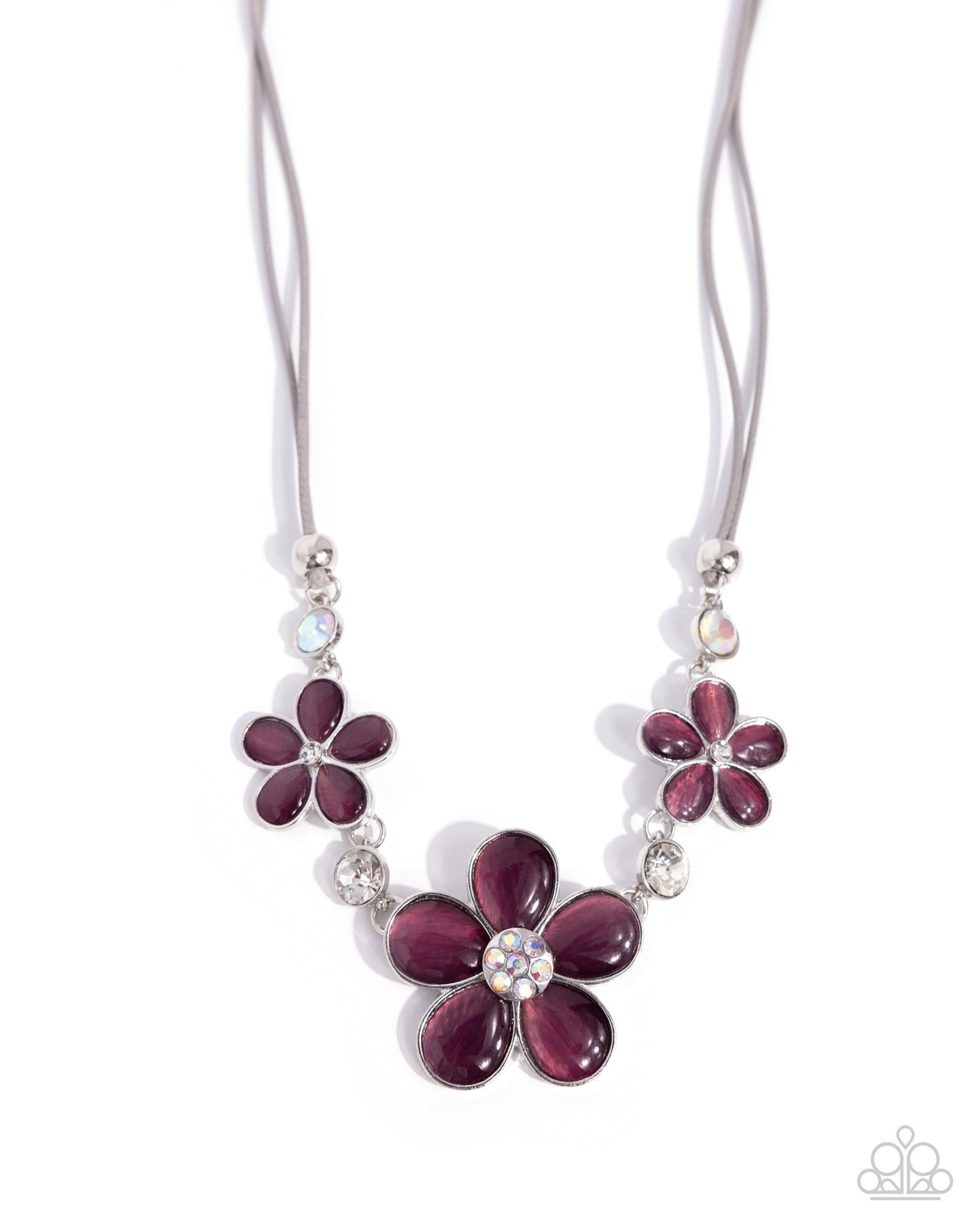 Infused along a doubled strand of gray cord, a collection of silver beads, iridescent and white gems in silver fittings, and purple cat's eye teardrop flowers in varying sizes coalesce below the neckline for a whimsical display. The smaller flowers feature white rhinestone centers while the larger flower features a light amethyst iridescent rhinestone-embellished center for additional feminine charm and shimmer. Features an adjustable clasp closure. Due to its prismatic palette, color may vary.