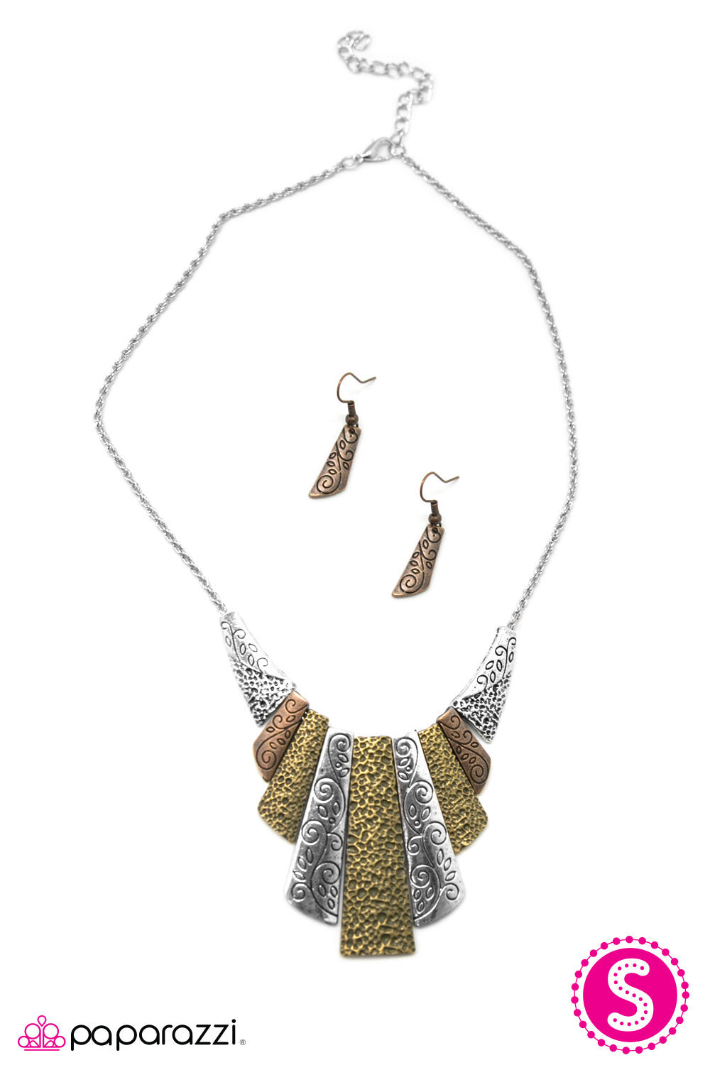Copper, silver and brass plates featuring various hammered and filigree textures fan out across the chest, creating a colorful metallic rainbow. Etched in feminine floral details, the gorgeous tribal design falls gracefully below the collar. Features an adjustable clasp closure. Sold as one individual necklace. Includes one pair of matching earrings.