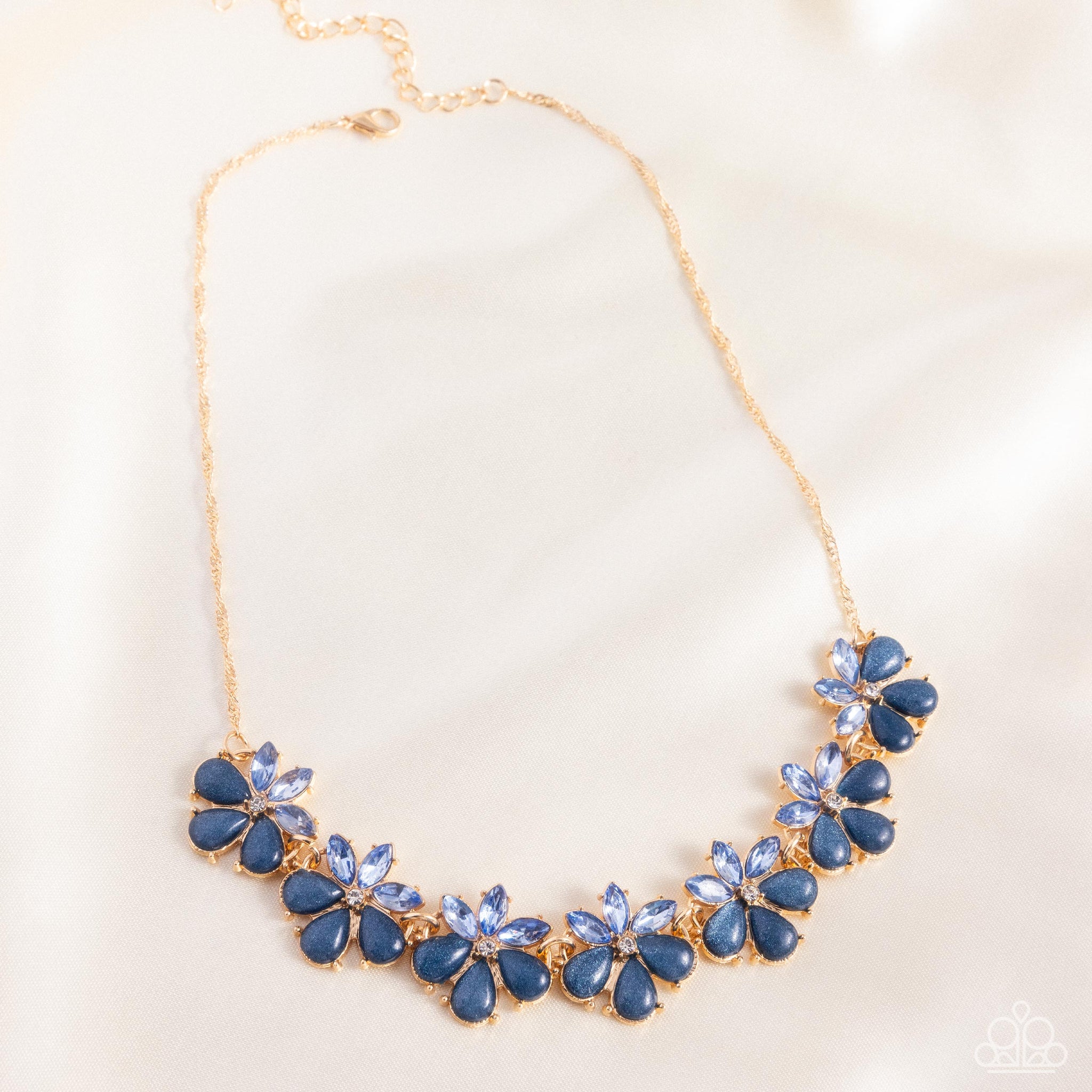 Connecting to a dainty gold singapore chain, a collection of gold-pronged, white rhinestone-centered flowers coalesce below the neckline. Navy glitter-infused teardrops and light sapphire marquise-cut gems create a half-and-half-petaled display around each flower for some prismatic pizzazz. Features an adjustable clasp closure.