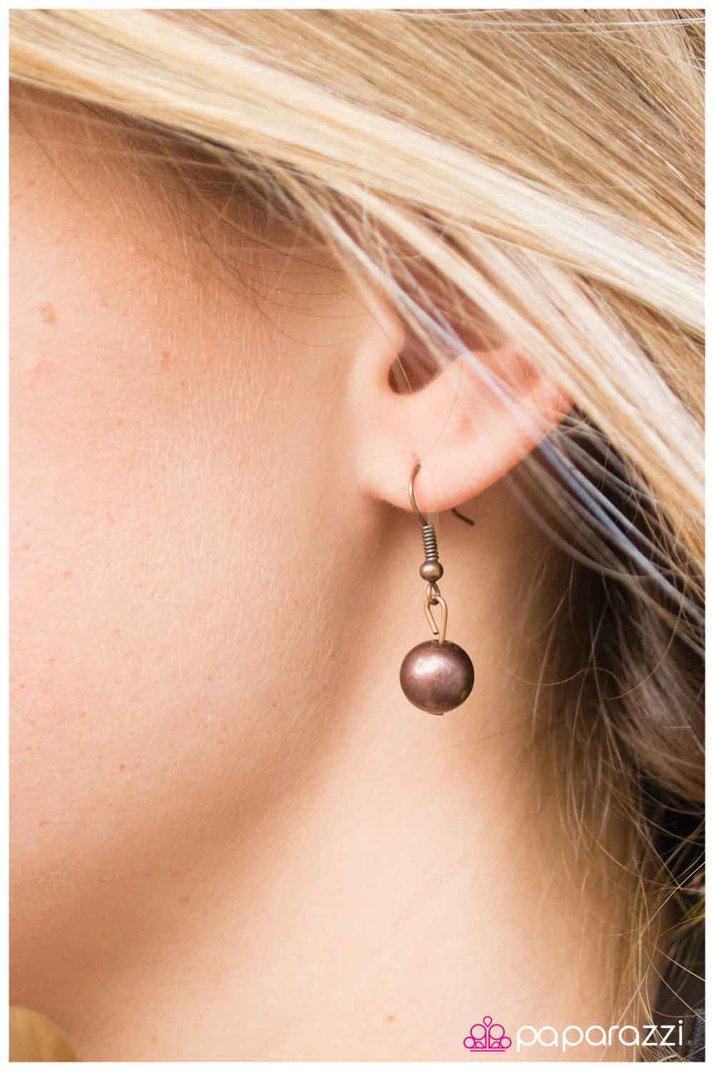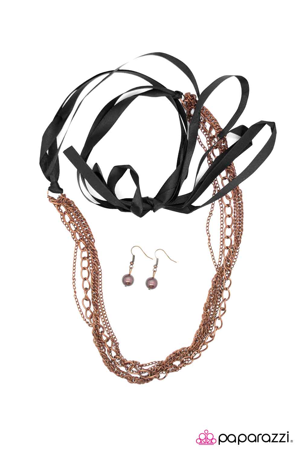 A variety of copper chains drape between two silky black ribbons. Ribbon tie closure allows for an adjustable fit. Sold as one individual necklace. Includes one pair of matching earrings.