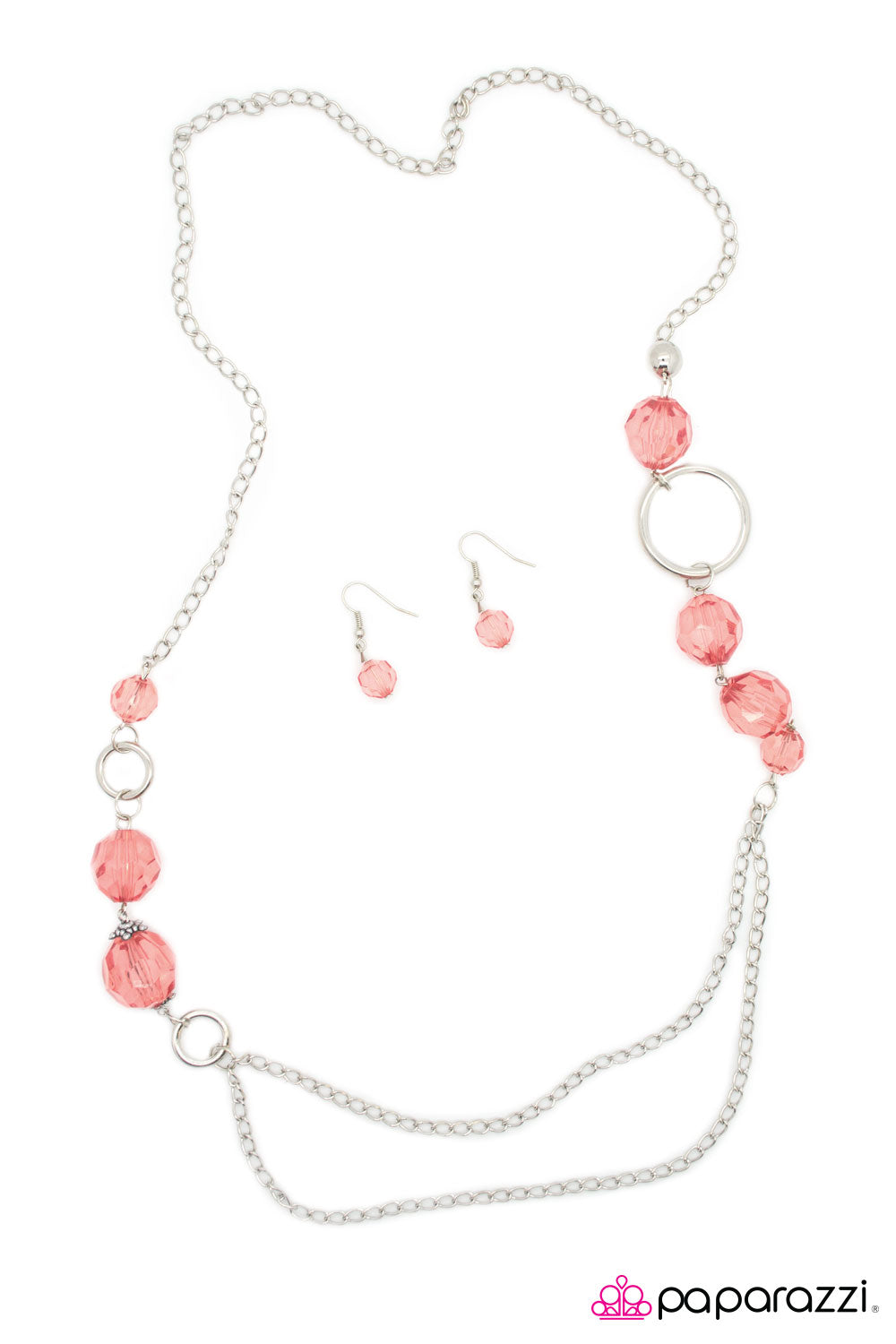 A collection of translucent coral crystal-like beads with light-catching faceted edges combines with a variety of silver rings to create a stunning display. Sold as one individual necklace. Includes one pair of matching earrings.