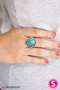 A smooth turquoise stone is pressed into the center of an antiqued silver frame radiating with rustic textures.