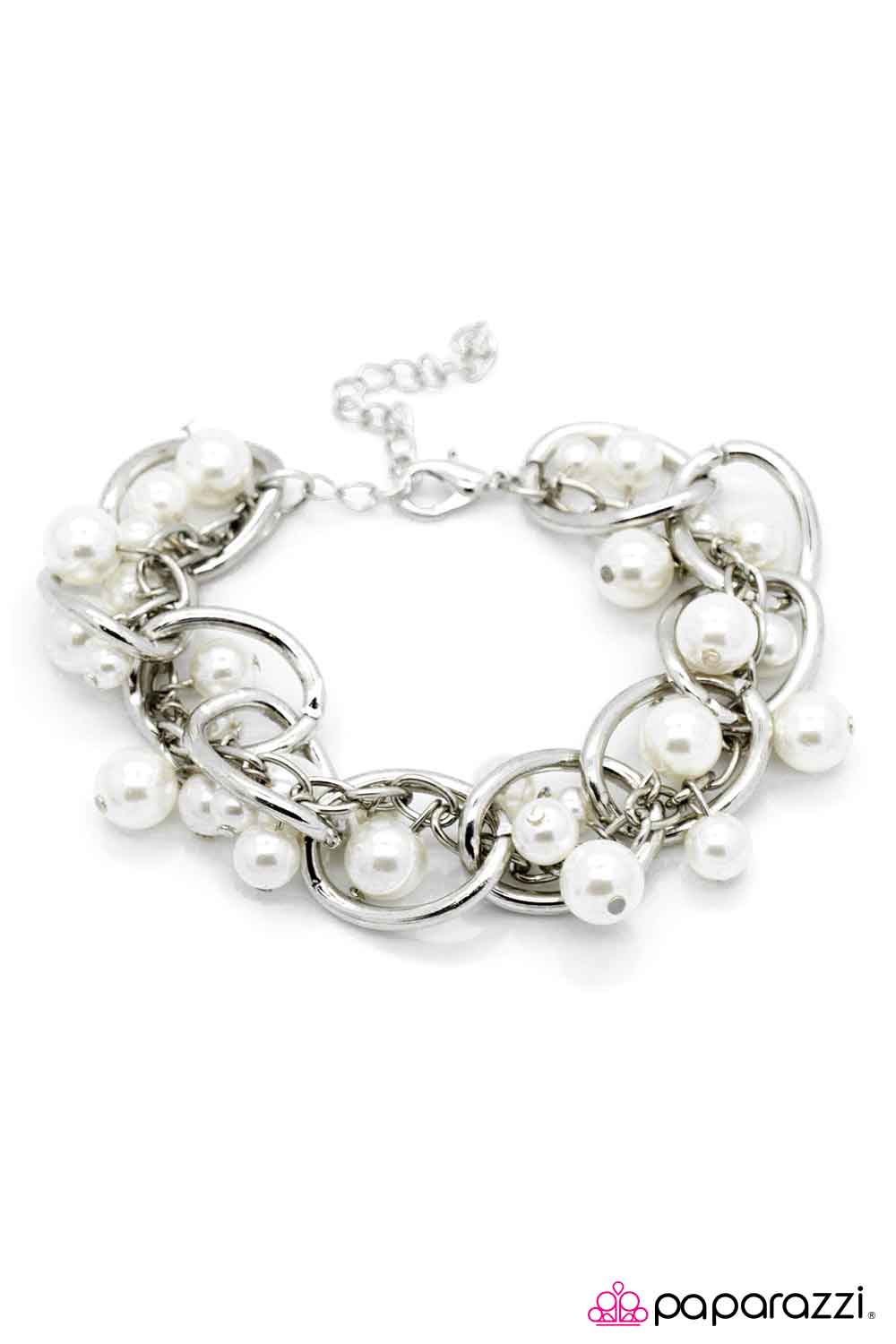 A strand of classic white pearls in an assortment of sizes is threaded through a strand of oversized silver links. Features an adjustable clasp closure. Sold as one individual bracelet.