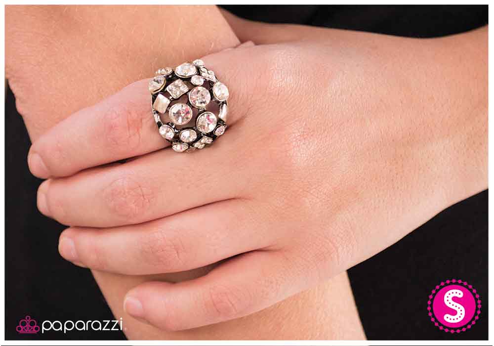 A curved silver plate is dotted with geometric shapes and glistening clear rhinestones. Sold as one individual ring.