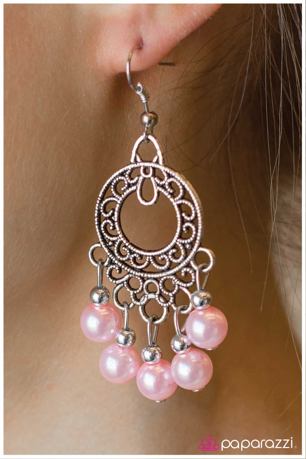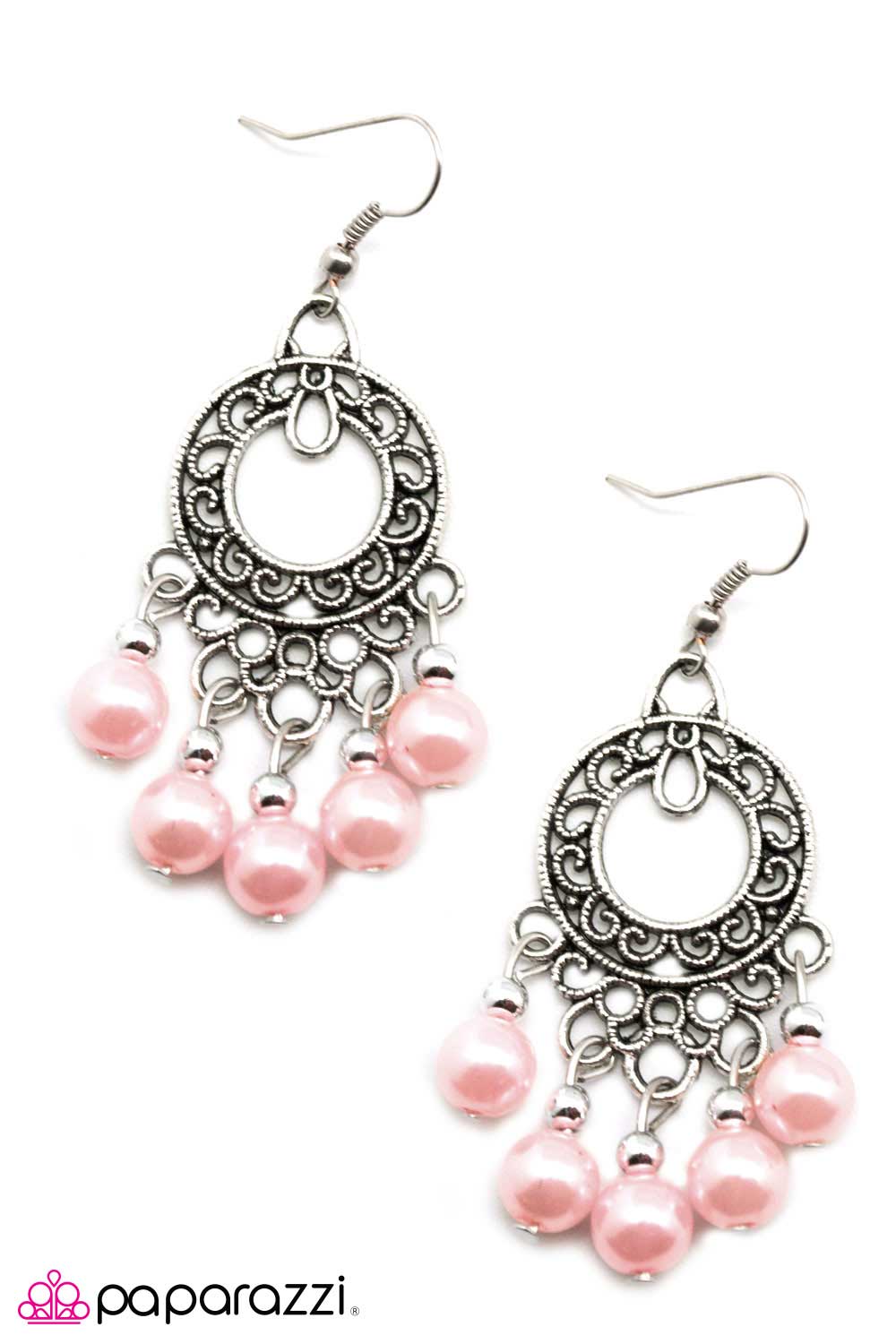 An ornate vintage frame with swirls of filigree is embellished with pink pearls in a chandelier-like fashion. Sold as one pair of earrings.