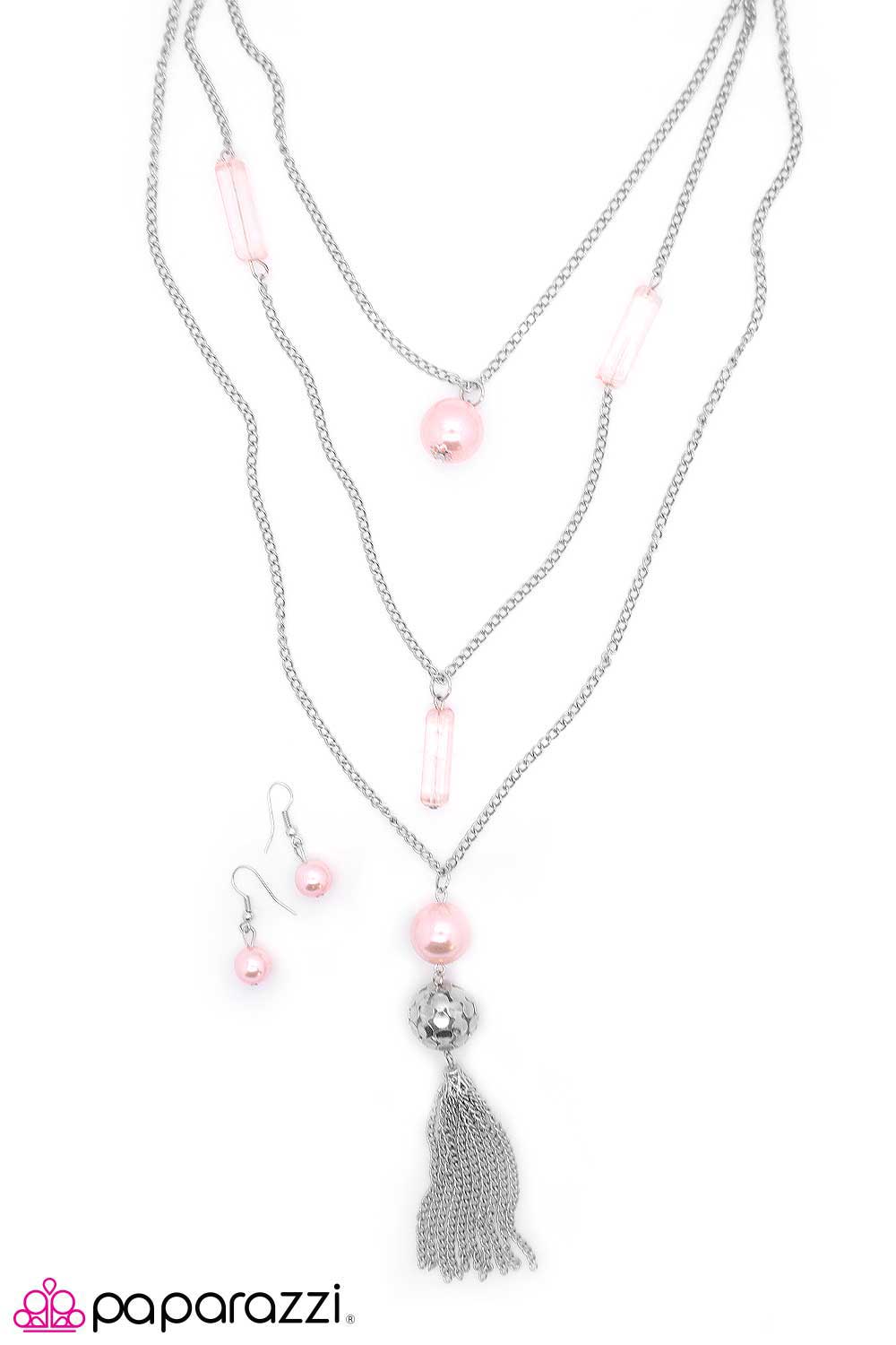 Three strands of delicate silver chain are tiered to create the illusion of three separate necklaces. The top strand features a single pink pearl that swings between the square prisms threaded along the second strand. The bottom strand adds dramatic length with its tassel of silver chain swinging from an airy silver sphere and a second pink pearl. Features an adjustable clasp closure. Sold as one individual necklace. Includes one pair of matching earrings.