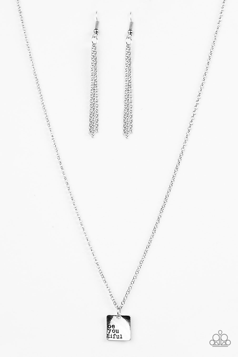 The phrase, “be you tiful” adorns the corner of a shiny silver square, creating an inspiring minimalistic design. Features an adjustable clasp closure. Sold as one individual necklace. Includes one pair of matching earrings.