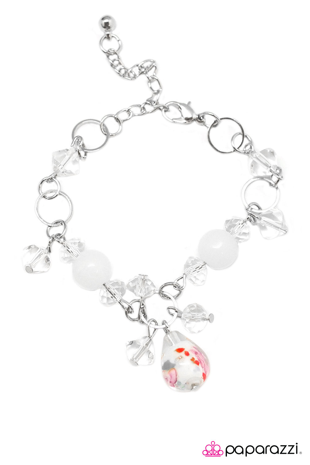 A mishmash of white crystals and a teardrop glass bead infused with a multicolored swirl of color dangle from an elegant collection of silver chain. Two cloudy white marbles sandwiched between two dazzling white crystals combine into a kaleidoscope of color. Features an adjustable clasp closure. Sold as one individual bracelet.