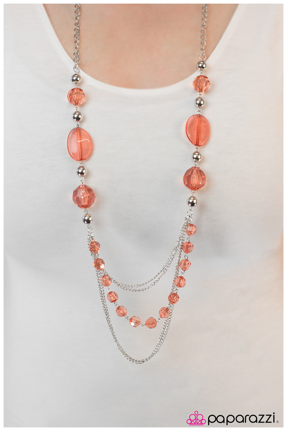 Tranquil orange beads finished in shimmering faceted edges cascade down a simple silver chain. Complemented with a row of dazzling orange gems and layered silver chain, the refreshing design creates an elegant elongating effect. Features an adjustable clasp closure. Sold as one individual necklace. Includes one pair of matching earrings.