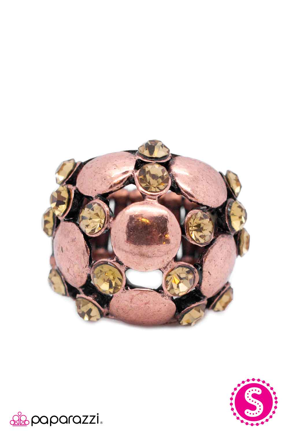 Sporadic copper circles and timeless topaz rhinestones connect to form a rounded plate. Sold as one individual ring.