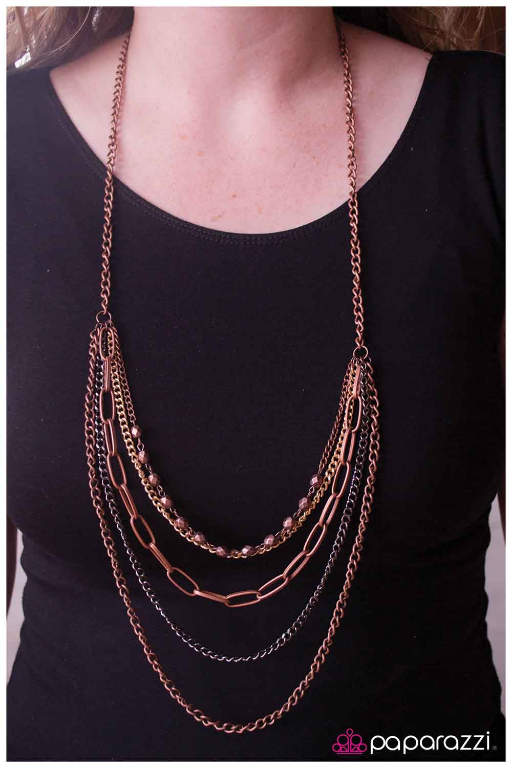 A frame of copper chain is the perfect backdrop for layers of complementing strands to drape between each side of this mixed-metal design. A strand of faceted copper beads brings texture while a diamond-cut gunmetal chain and a strand of gold add shimmer. Features an adjustable clasp closure. Sold as one individual necklace. Includes one pair of matching earrings.