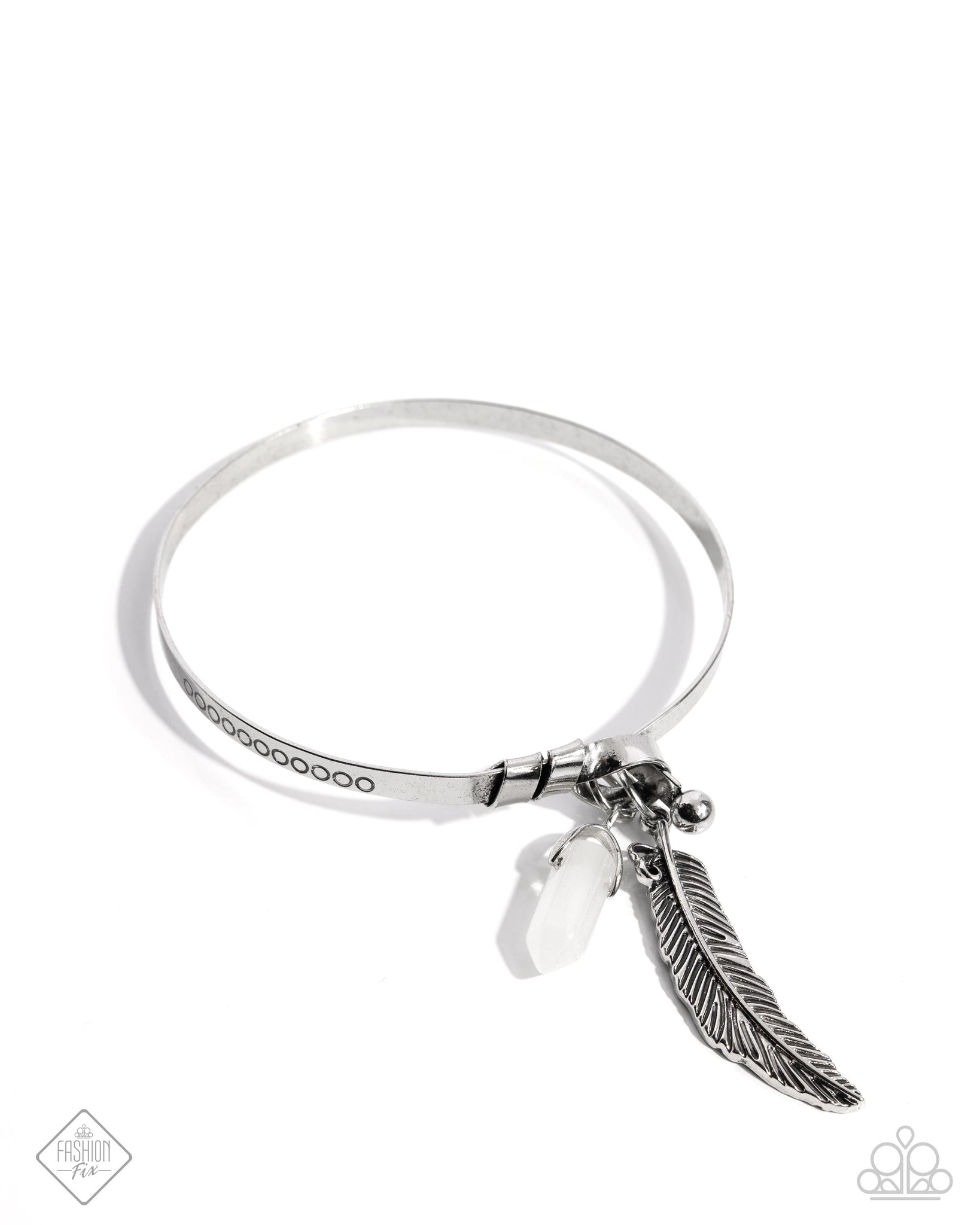 Stamped with rustic circles, a glistening band of silver extends along the wrist for a timeless display. A white quartz stone, silver bead, and tactile-textured silver feather swing from one end of the display for a free-spirited flourish. Features a hook and eye closure. As the stone elements in this piece are natural, some color variation is normal.