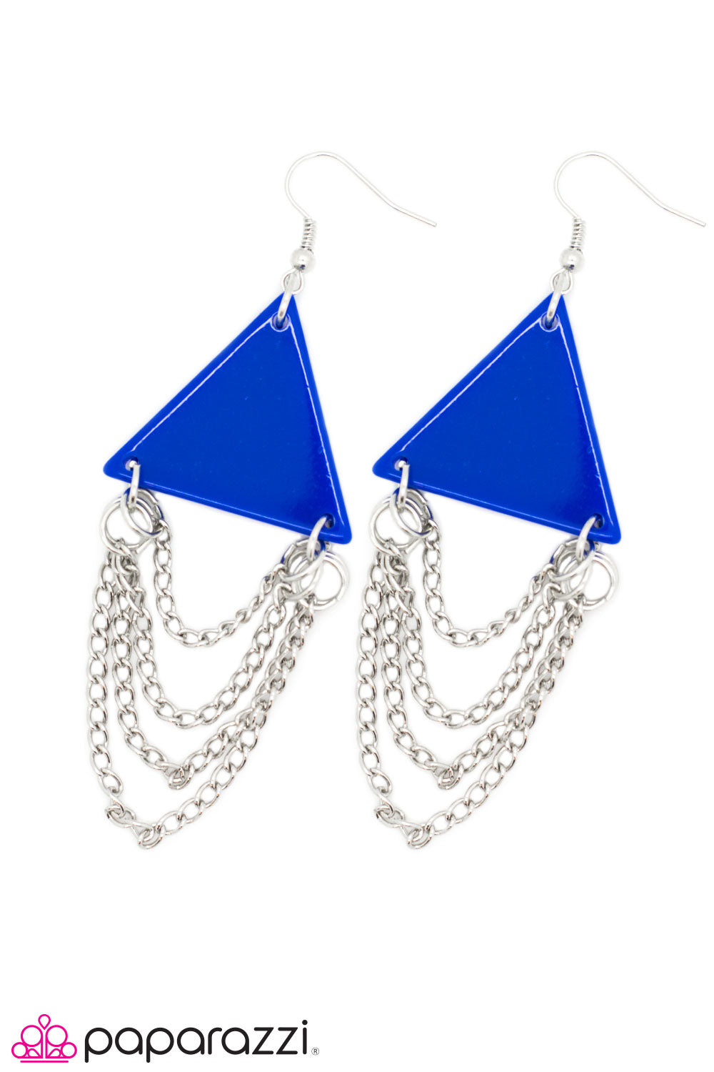 Four Layers of silver chain and clusters of rings hang below a Royal Blue triangle for an undeniably geometric look . sold as one pair of earrings.
