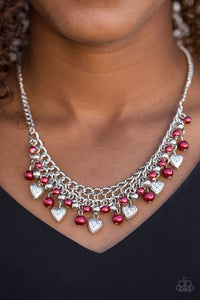 Two shimmery silver chains interlock below the collar. Ornate silver heart charms and red pearlescent beading cascades from the interlocked chains, creating a whimsical fringe. Features an adjustable clasp closure.