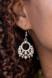 Glittery white rhinestones and brown pearls are sprinkled across a round silver frame, creating an elegant lure. Earring attaches to a standard fishhook fitting.