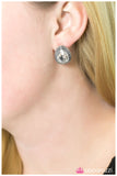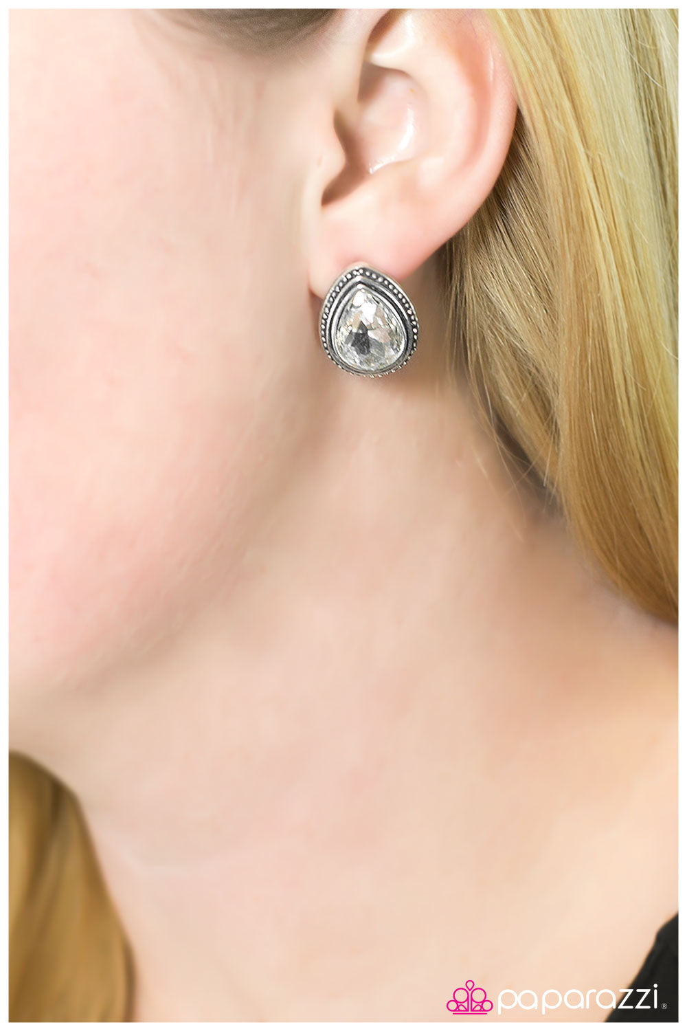 A white teardrop gem featuring a dazzling faceted surface is nestled inside a stunning studded silver frame. The sparkling gem and antiqued frame create a romantic and regal display. Earring attaches to a standard post fitting. Sold as one pair of post earrings.