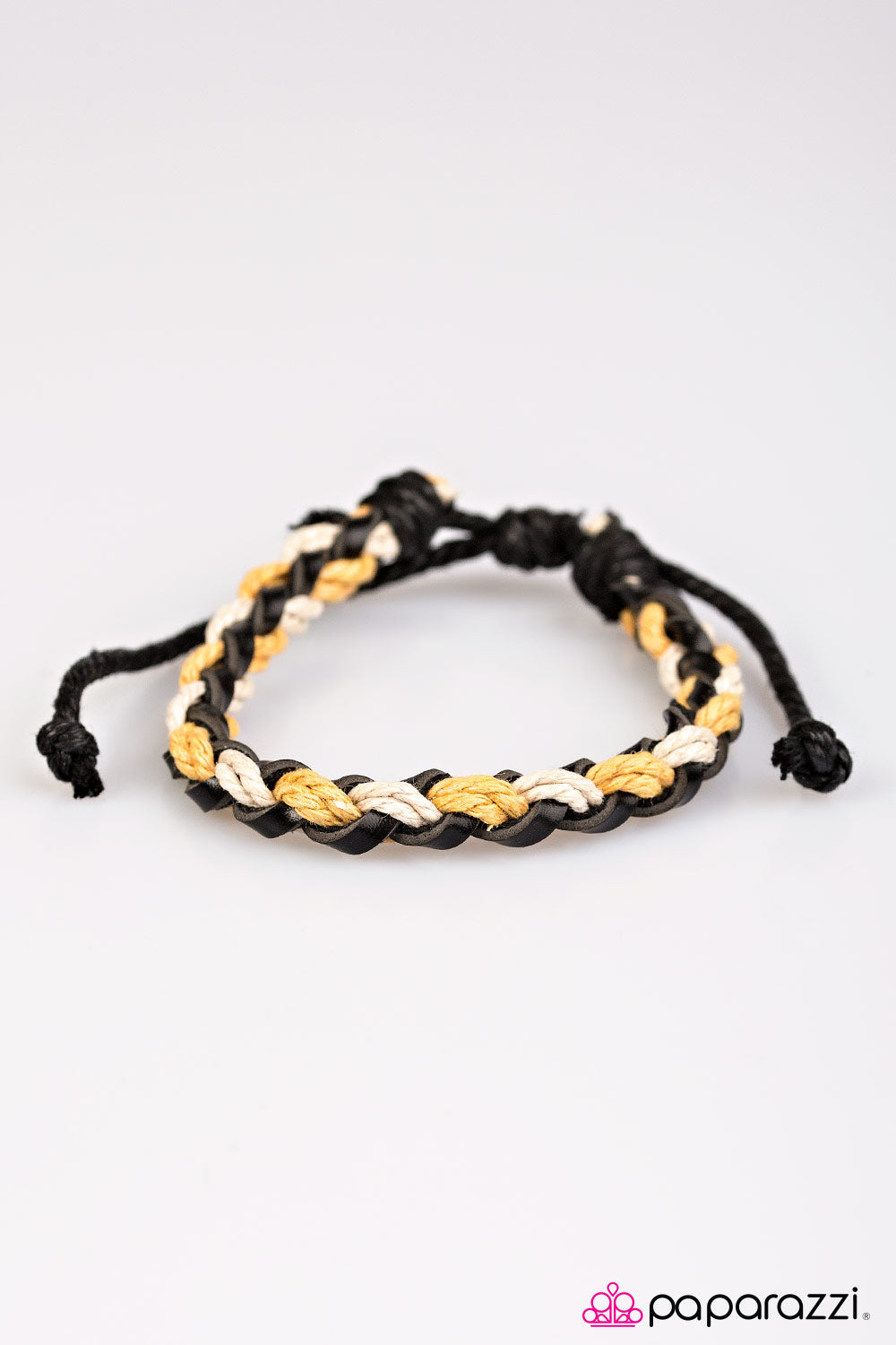 White and yellow cording braids with a skinny strand of black leather around the wrist for a wild look. Features an adjustable sliding knot closure. Sold as one individual bracelet.